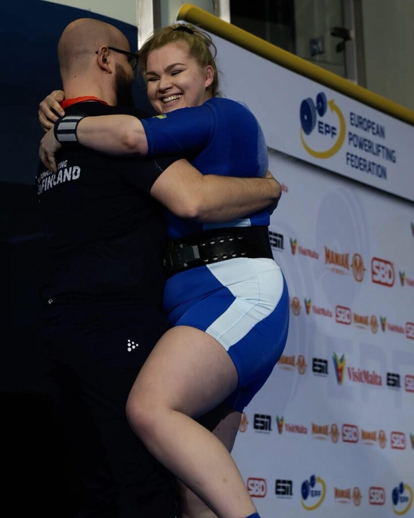 Kuva (EPF): Emilia Haataja juhli viime kevään EM-kisoissa onnistuneen penkkisuorituksen jälkeen, huoltajana Ville Niskanen